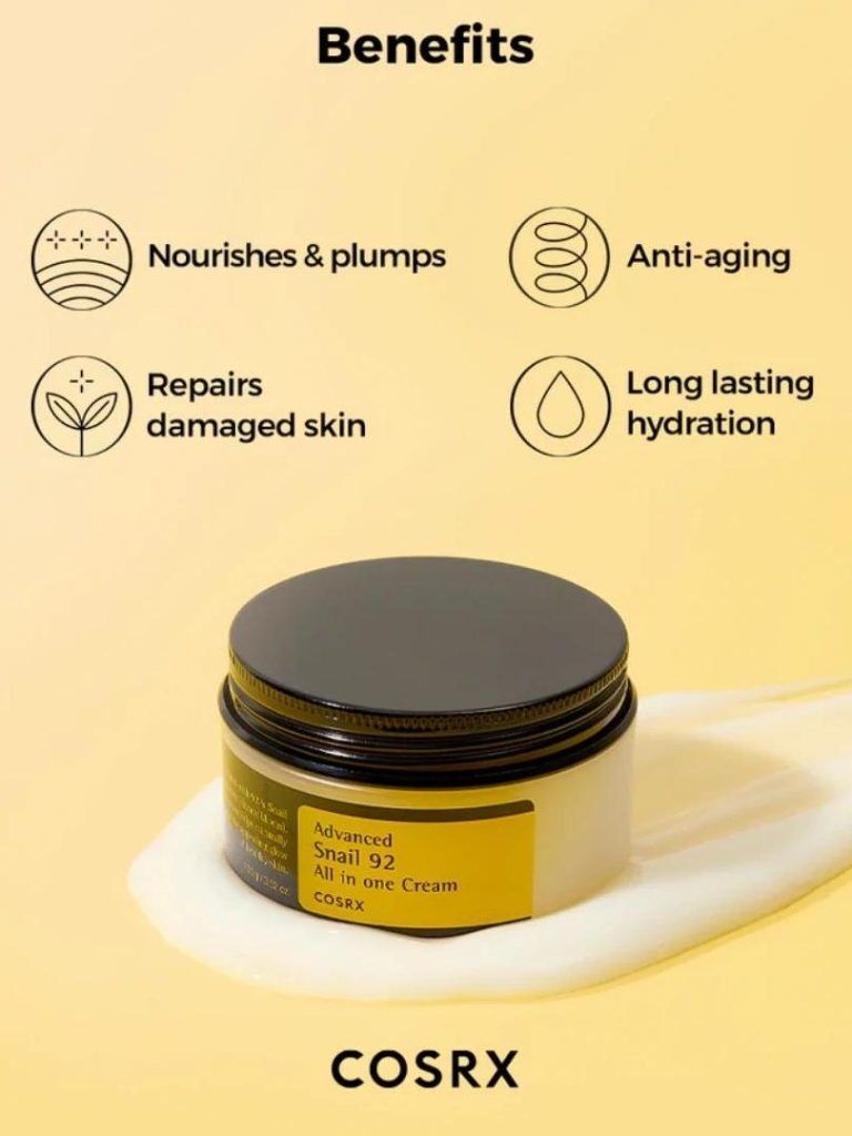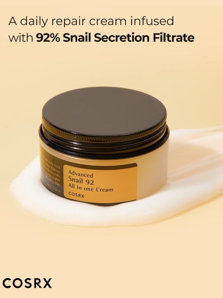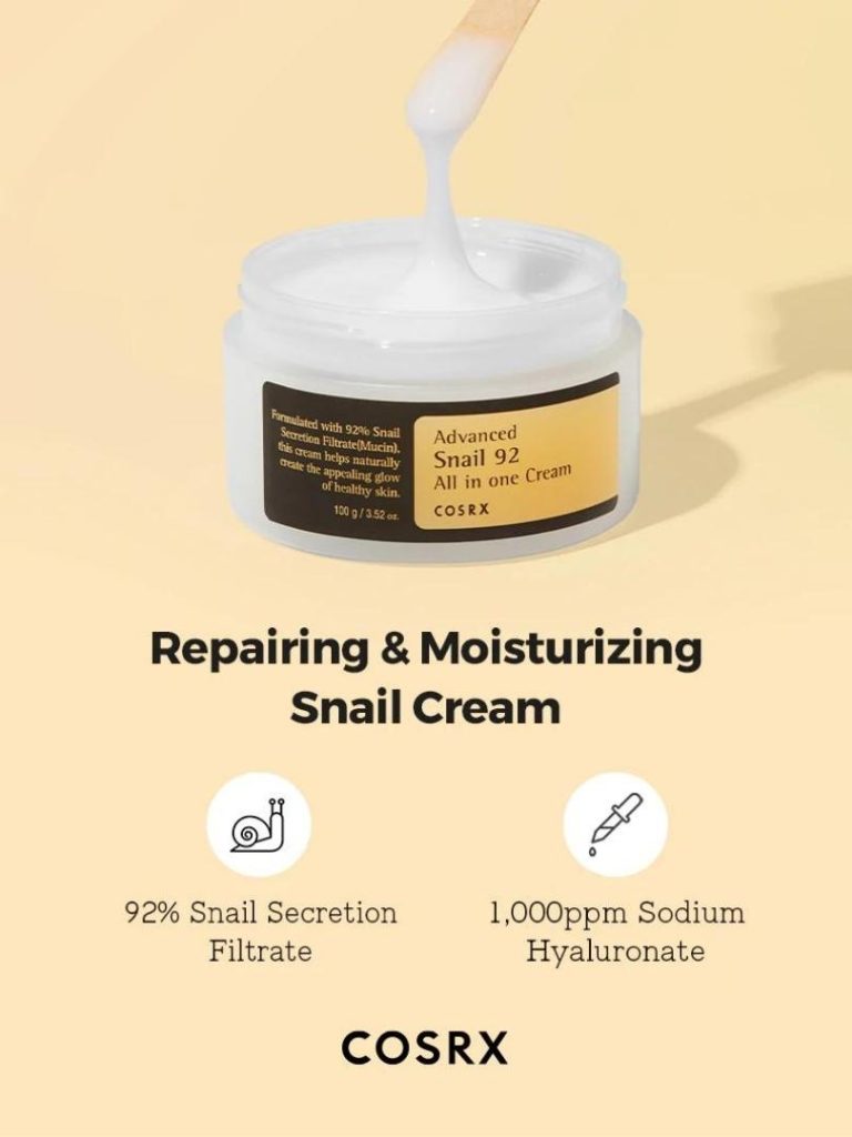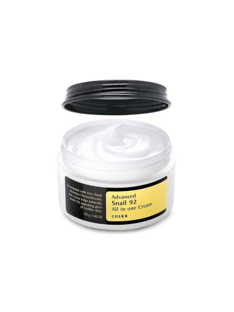 Το Cosrx Advanced Snail 92 All in one cream της COSRX είναι μια ενυδατική κρέμα εμπλουτισμένη με 92% βλεννίνη σαλιγκαριού που θρέφει και ενυδατώνει την επιδερμίδα χωρίς ίχνος λιπαρότητας. Αυτή η κρέμα γλιστρά πάνω στο δέρμα και δημιουργεί ένα φράγμα υγρασίας που γεμίζει, ενυδατώνει και καταπραΰνει το δέρμα. Μια κρέμα 3 σε 1 που επιδιορθώνει, επαναφέρει, αναδομεί το δέρμα. Ιδανική για να καταπραϋνει μετά τις εξάρσεις το ερεθισμένο και ευαίσθητο δέρμα. Διαθέτει ελαφριά υφή τύπου gel που απορροφάται άμεσα από το δέρμα αφήνοντας το φρέσκο και γεμάτο θρέψη.