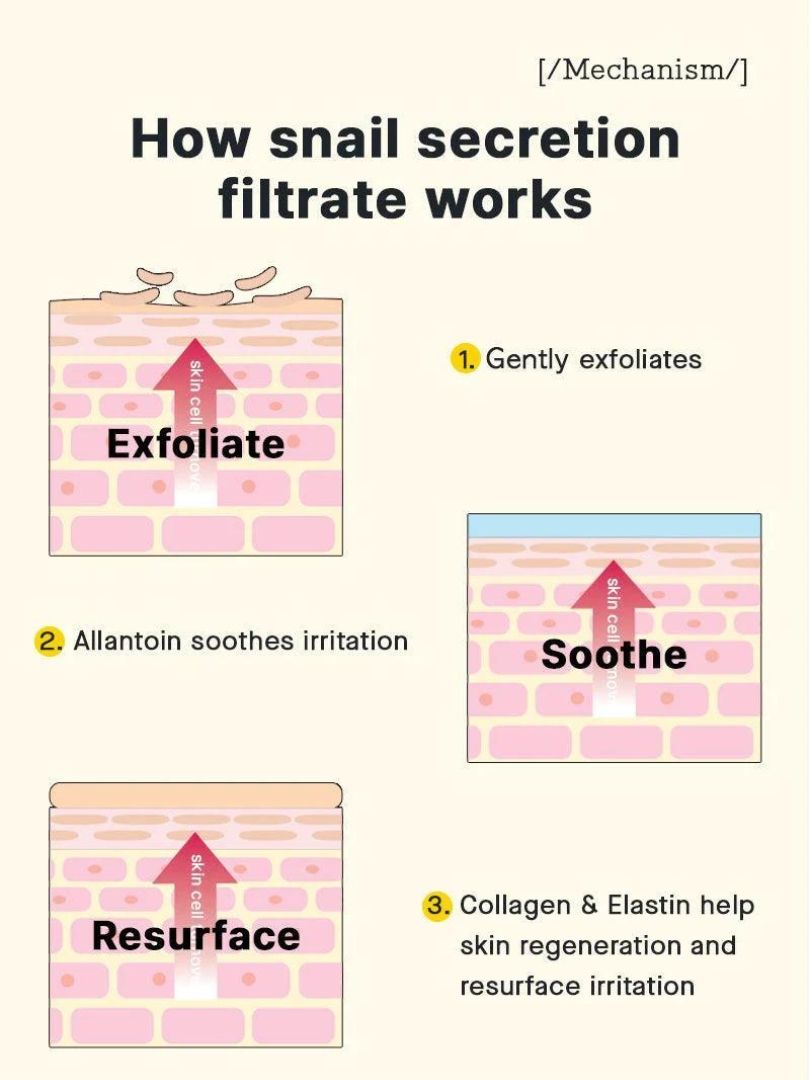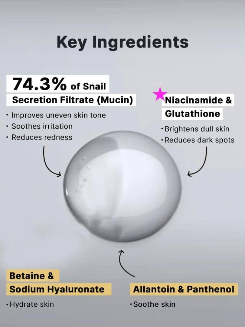 - 74,3% Triple Snail Complex : Ένα σύμπλεγμα που συνδυάζει τις ενυδατικές ιδιότητες και το plumping effect του διηθήματος έκκρισης σαλιγκαριού με τα οφέλη αντιγήρανσης και μείωσης των πόρων από το διήθημα μαύρων σαλιγκαριών και την αντιβακτηριακή, αντιοξειδωτική UV προστασία των gold snails.