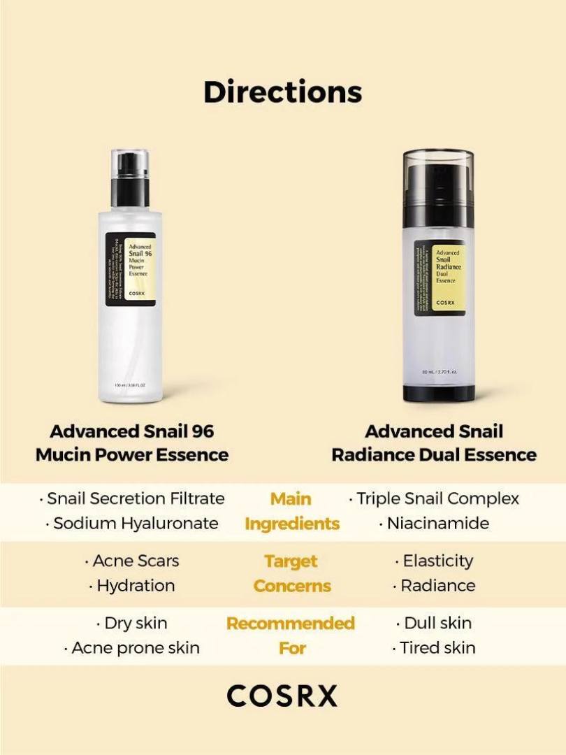 Το Cosrx Advanced Snail Radiance Dual Essence είναι ένα διπλό essence που συνδυάζει τα οφέλη της βλεννίνης σαλιγκαριού και την νιασιναμίδης. Μια αντλία, δυο πανίσχυρα συστατικά, ένας συνδυασμός που φωτίζει, ενυδατώνει, συσφίγγει και αφήνει την επιδερμίδα πιο ελαστική και plumped. Το εκκριμμα σαλιγκαριού κάνει απαλή απολέπιση, η αλλαντοίνη ηρεμεί και καταπραύνει, το κολλαγόνο και η ελαστίνη αναγεννούν τα κύτταρα και την επιδερμίδα.