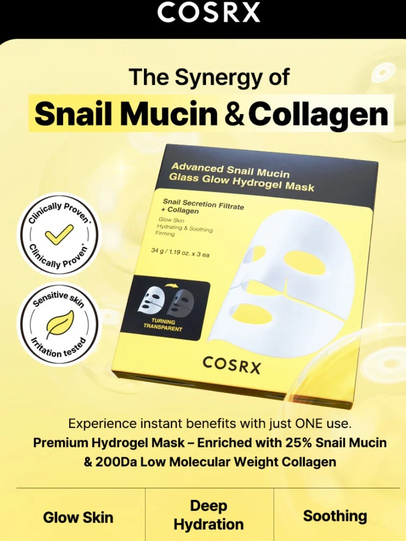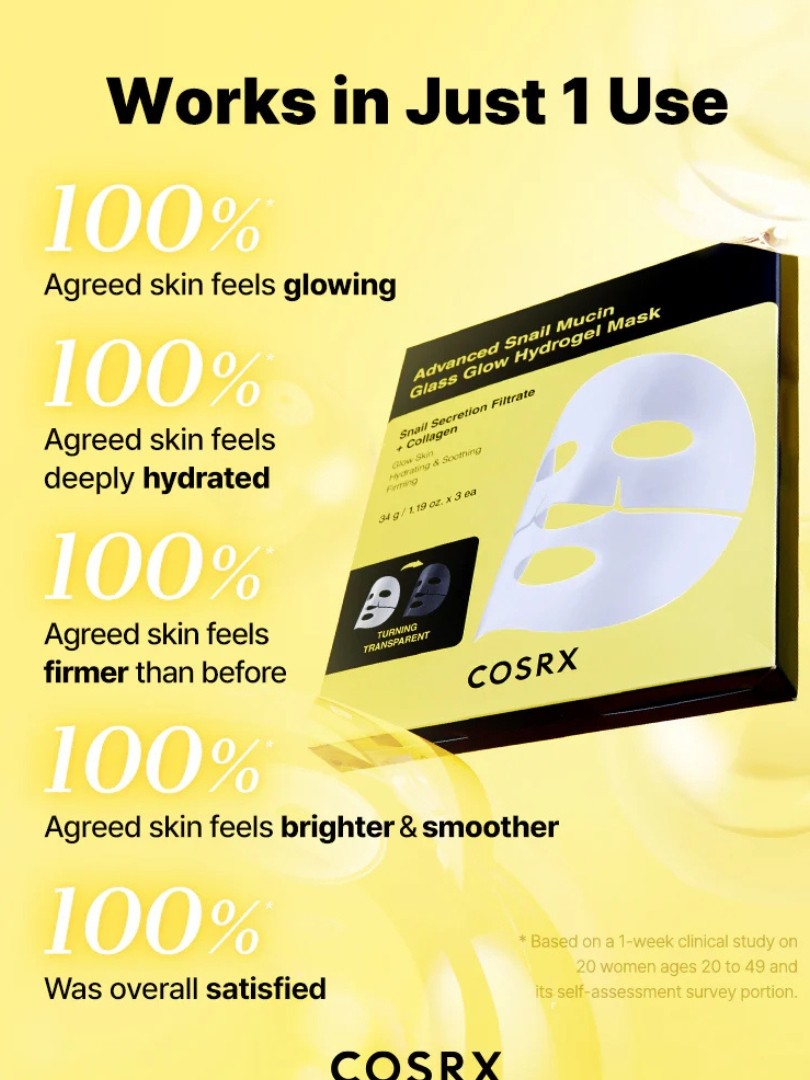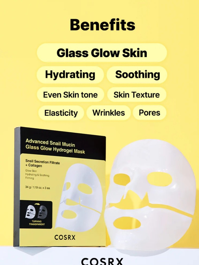 Η μάσκα COSRX Advanced Snail Mucin Glass Glow Hydrogel Mask είναι μια overnight μάσκα κολλαγόνου που προσφέρει βαθιά ενυδάτωση, λάμψη και σύσφιξη. Μια μάσκα ιδανική για να επανακτίσουμε την λάμψη στο θαμπό και άτονο δέρμα. Καταραύνει, ενυδατώνει και επαναφέρει την ελαστικότητα και την σφιγηλότητα.