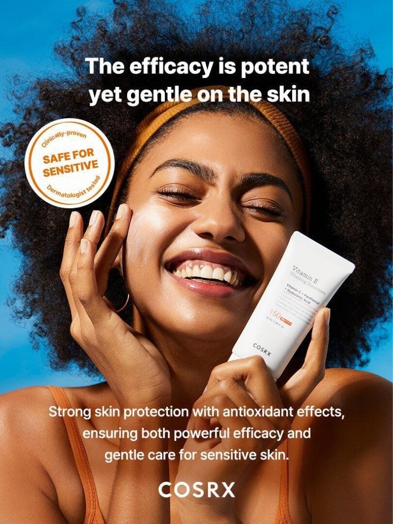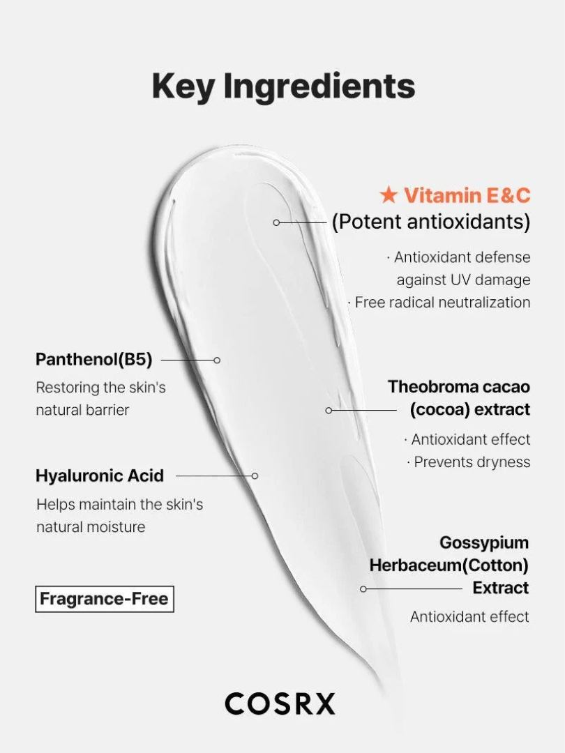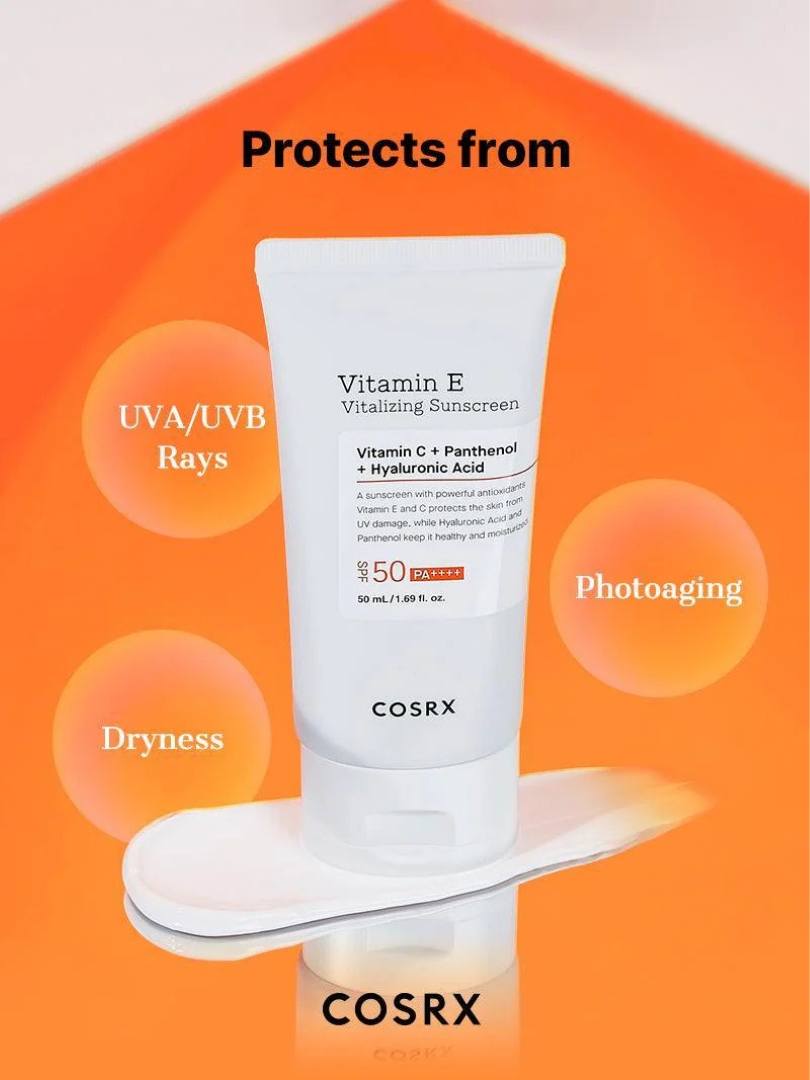 Το COSRX Vitamin E Vitalizing Sunscreen SPF 50++++ είναι ένα αντηλιακό με ισχυρή αντιοξειδωτική δράση. Οι βιταμίνες Ε και C προστατεύουν το δέρμα από τις βλάβες που προκαλεί η υπεριώδης ακτινοβολία, ενώ το Υαλουρονικό Οξύ και η Πανθενόλη το διατηρούν υγιές και ενυδατωμένο.