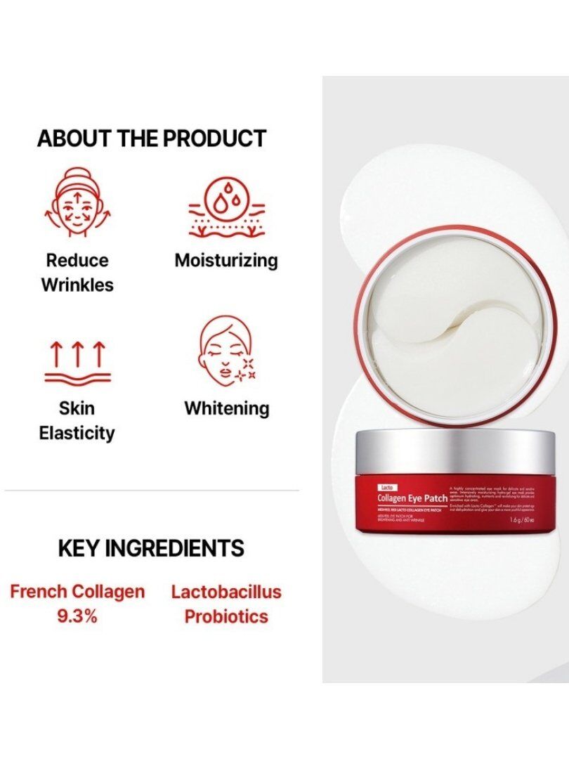 Tα Red Lacto Collagen επιθέματα ματιών της Medi-peel είναι ειδικά σχεδιασμένα επιθέματα ματιών που προσφέρουν εντατική φροντίδα στην ευαίσθητη περιοχή γύρω από τα μάτια. Με σύνθεση πλούσια σε κολλαγόνο, προβιοτικά και φυσικά εκχυλίσματα, αυτά τα patches συμβάλλουν στη μείωση των λεπτών γραμμών, των μαύρων κύκλων και του πρηξίματος, ενώ ενισχύουν την ελαστικότητα και τη λάμψη της επιδερμίδας.