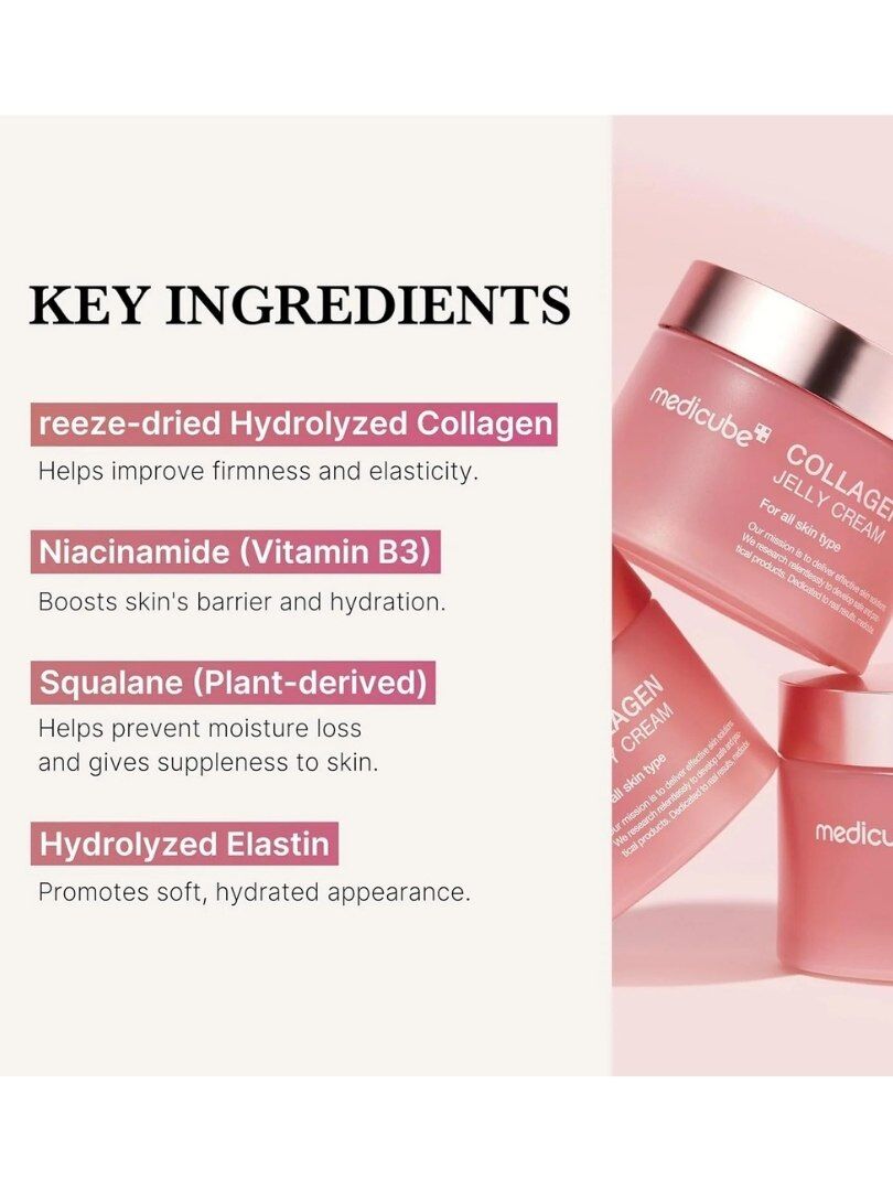 Η Medicube Collagen Jelly Cream 50ml είναι μια διάφανη κρέμα-ζελέ, εξοπλισμένη με άφθονο κολλαγόνο, γνωστό για τα αντιγηραντικά οφέλη του.