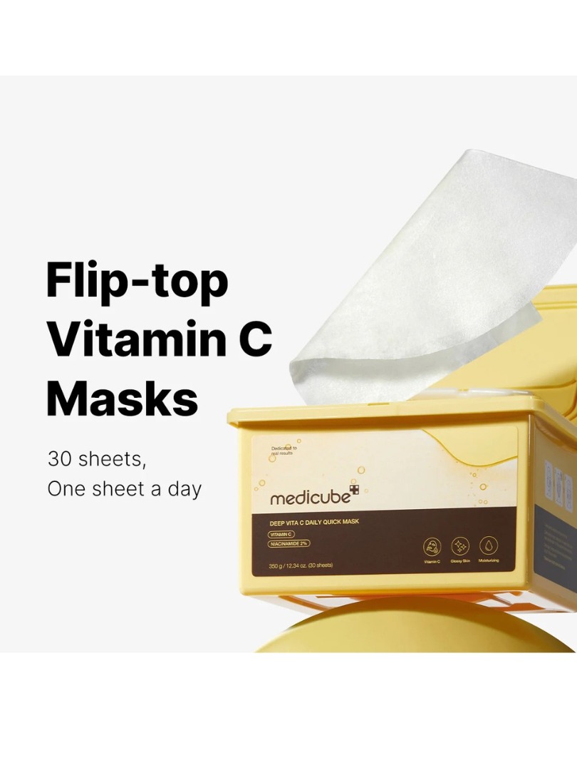Το σετ μασκών Medicube Deep Vita C Daily Quick Mask στοχεύει στις δυσχρωμίες και την θαμπή όψη και είναι εμποτισμένες με ορό βιταμινών και ρετινόλη για αποτέλεσμα λάμψης και φωτεινότητας. Η φόρμουλα αυτή σχεδιάστηκε για να καλύψει τις ανάγκες κάθε επιδερμίδας και υπόσχεται αποτελέσματα από τα πρώτα λεπτά χρήσης. H συσκευασία τους έχει πρακτικό άνοιγμα ώστε να μην χάνουν τις ενυδατικές ιδιότητες τους και είναι κατάλληλες για καθημερινή χρήση.
