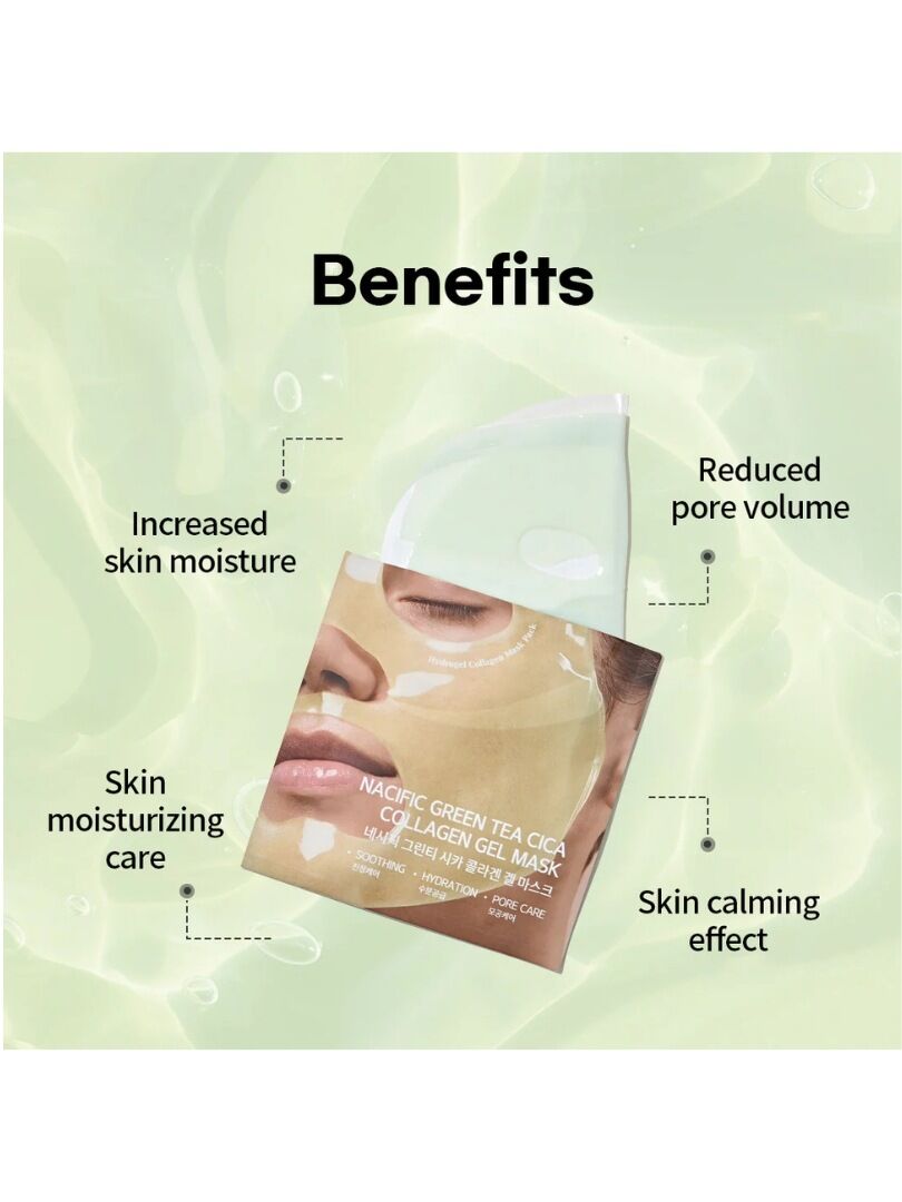 H Green Tea Cica Collagen Gel Mask της Nacific είναι μια μάσκα τύπου τζελ που συνδυάζει τα πλεονεκτήματα του πράσινου τσαγιού και της centella asiatica (Cica), προσφέροντας εξαιρετική ενυδάτωση και αναζωογόνηση στο δέρμα. Αυτή η μάσκα ενισχύει την υφή του δέρματος, μειώνει τους πόρους και παρέχει λείο αποτέλεσμα , ενώ ταυτόχρονα προσφέρει ισχυρή αντιοξειδωτική και καταπραϋντική δράση.