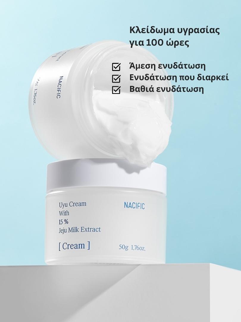Η Nacific Uyu cream είναι μια κρέμα που προσφέρει θρέψη και βαθιά ενυδάτωση στο ξηρό και αφυδατωμένο δέρμα. Περιέχει εκχύλισμα γάλακτος σε ποσοστό 15% που γεμίζει άμεσα με υγρασία το αφυδατωμένο δέρμα και σύμπλεγμα 5 πεπτιδίων που κλειδώνει την υγρασία στο εσωτερικό του δέρματος, με αποτέλεσμα ενυδατωση που διαρκεί έως και 100 ώρες.