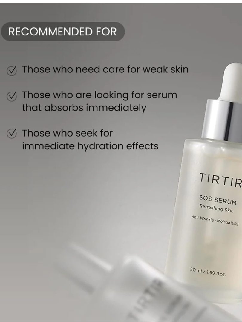 Το Tirtir SOS Serum είναι ένας ορός ειδικά σχεδιασμένος για να καταπραΰνει και να ενυδατώνει το ευαίσθητο δέρμα. Η φόρμουλά του περιέχει ισχυρά συστατικά που βοηθούν στην ανακούφιση του ερεθισμού και της ερυθρότητας. Χάρη στην ελαφριά και μη λιπαρή υφή του, απορροφάται εύκολα από την επιδερμίδα, αφήνοντάς την απαλή και αναζωογονημένη.