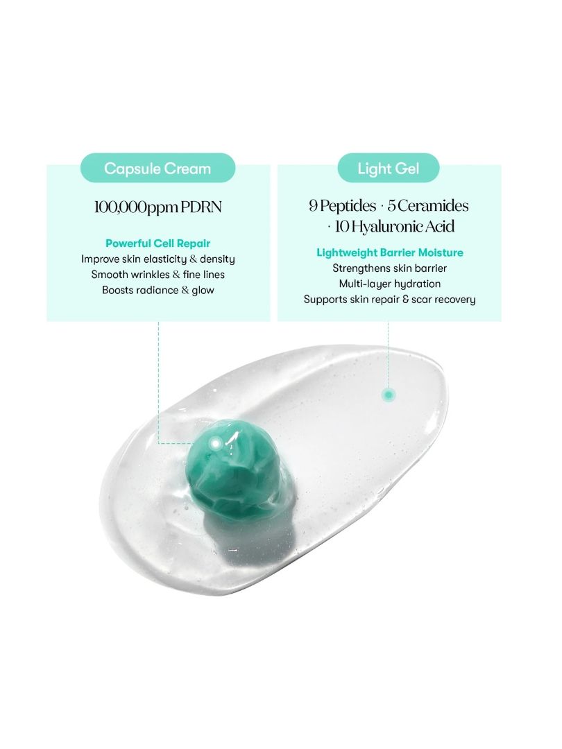 • Διπλή λάμψη: Περιλαμβάνει συμπυκνωμένες κάψουλες PDRN σε ένα ελαφρύ ενυδατικό τζελ που απορροφάται σε βάθος για να θρέψει το δέρμα και να ενισχύσει ένα υγιές, λαμπερό φινίρισμα.