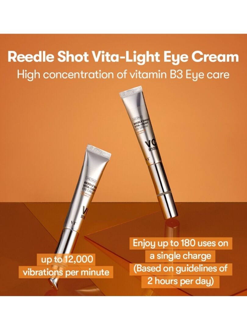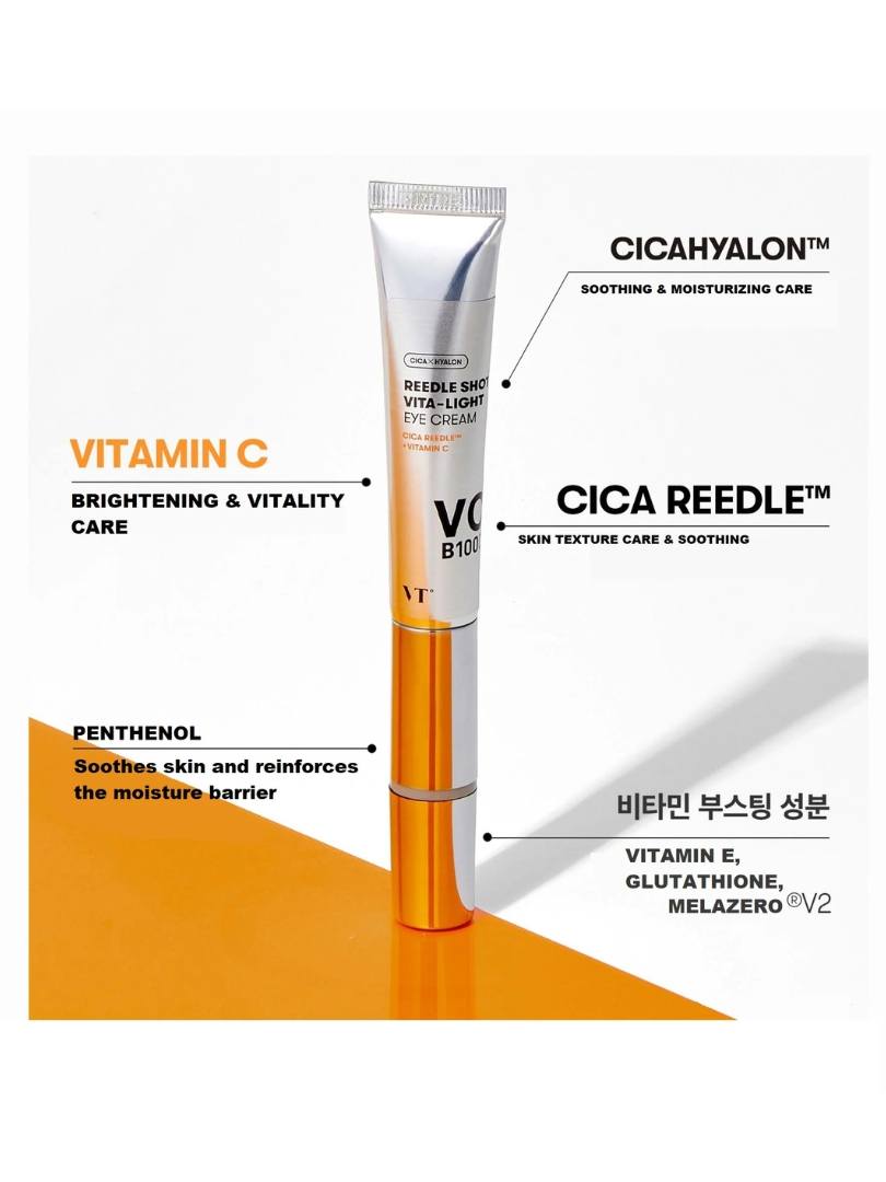 Η VT Reedle shot Vita-light eye cream είναι μια κρέμα γεμάτη με θρεπτικά συστατικά όπως οι βιταμίνες C, E και B3 καθώς και γλουταθειόνη που βοηθά στη μείωση των μαύρων κύκλων και της υπερμελάγχρωσης, παρέχοντας παράλληλα θρεπτικά οφέλη. Διατίθεται σε συσκευασία σωληναρίου, ειδικά σχεδιασμένη με μεταλλικό άκρο που κάνει μικροδονήσεις και βοηθά στο μείωση του πρηξίματος. Κάντε μασάζ στην περιοχή των ματιών για να αναζωογονήσετε το κουρασμένο και πρησμένο δέρμα.