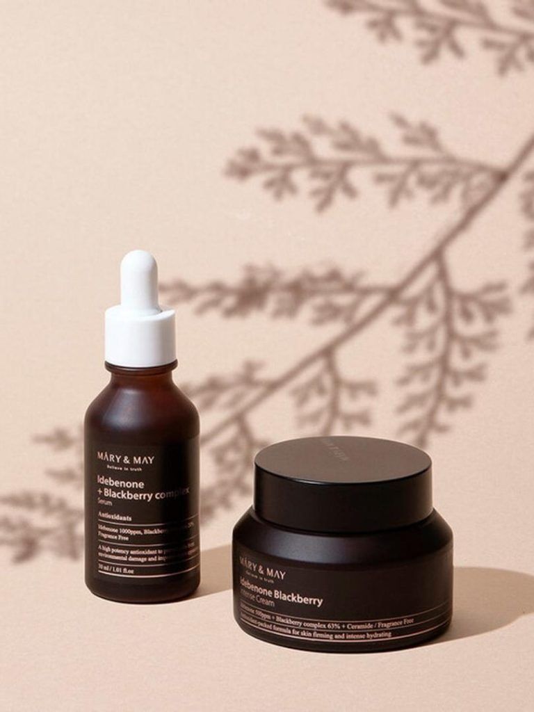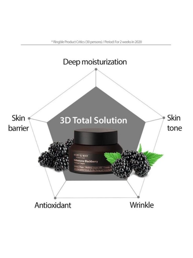 Mary & May Idebenone & Blackberry Intense Cream is a moisturizer containing 500ppm idebenone and 63% Blackberry Complex Extract, a powerful antioxidant formula to tighten and intensely hydrate skin. It has a silky texture and is moisturizing without being heavy or greasy.
