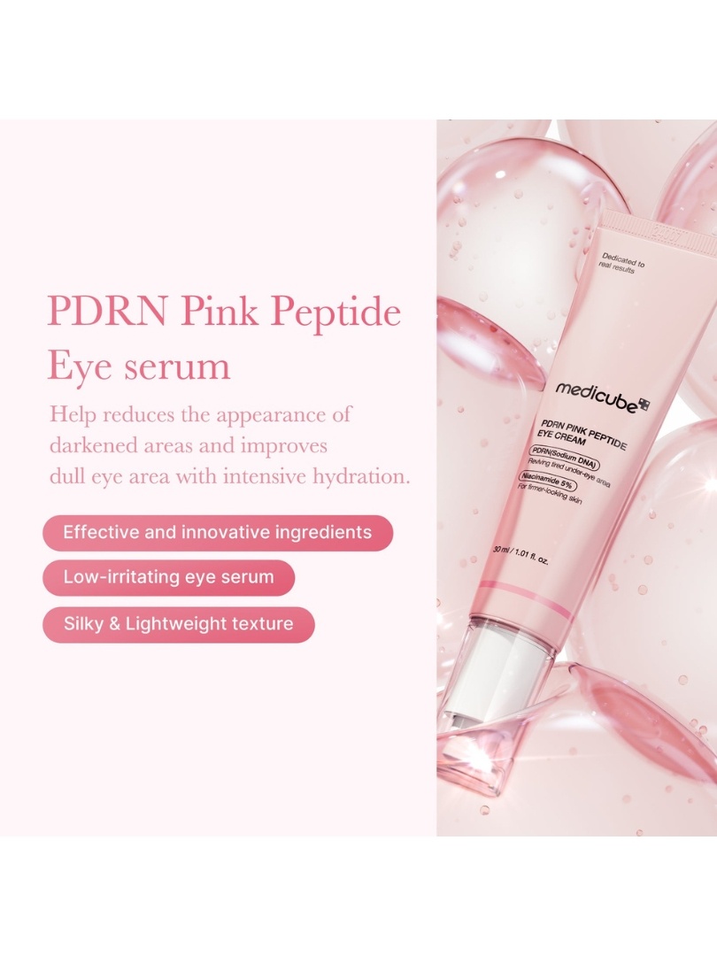 THE Medicube PDRN Pink Peptide Eye Cream είναι μια προηγμένη κορεάτικη κρέμα ματιών υψηλής απόδοσης, ειδικά σχεδιασμένη για να αντιμετωπίζει ρυτίδες, λεπτές γραμμές, μαύρους κύκλους, πρήξιμο και θαμπή όψη στην ευαίσθητη περιοχή γύρω από τα μάτια. Η καινοτόμος σύνθεσή της συνδυάζει PDRN από DNA σολομού, peptides, ρετινόλη υψηλής καθαρότητας and niacinamide, προσφέροντας ορατή σύσφιξη, ενίσχυση της ελαστικότητας και φωτεινότητα από τις πρώτες εβδομάδες χρήσης.