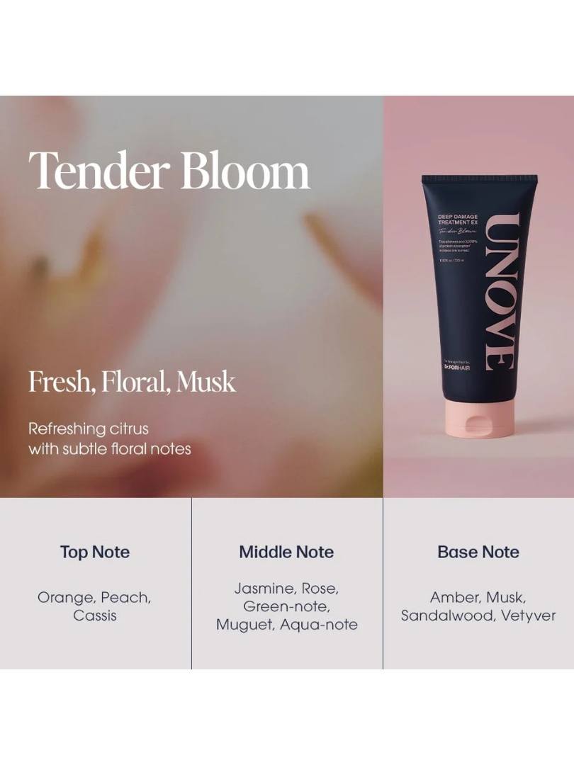 Η UNOVE Deep Damage Treatment EX- Tender Bloom είναι μια θεραπεία με πλούσια σύνθεση κερατίνης που αποκαθιστά τη δύναμη και την απαλότητα στα ταλαιπωρημένα μαλλιά. Μια μάσκα μαλλιών εντατικής επανόρθωσης. Διαθέτει κρεμώδη υφή που μεταμορφώνεται σε τζελ κατα την επαφή με το νερό. Ήπιο για τα μαλλιά, χωρίς δοκιμές σε ζώα, χωρίς SLS/SLES, χωρίς parabens. Ελεγμένο για αποτελεσματικότητα στις θεραπείες κερατίνης.