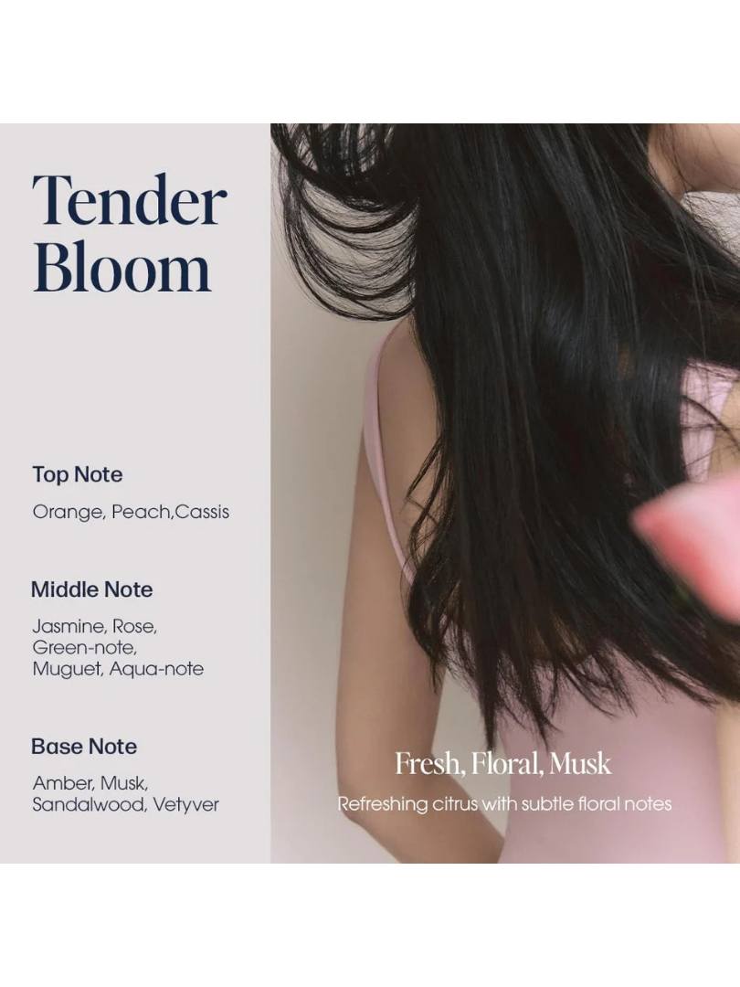 Tender Bloom: Μαγευτικό λουλουδάτο άρωμα με αρμονικό μείγμα από πικάντικα εσπεριδοειδή και απαλά λουλουδάτα αρώματα. Πορτοκάλι, Ροδάκινο, Κάσις, Γιασεμί, Τριαντάφυλλο, Μουγκέ, Νότα Νερού, Κεχριμπάρι, musk, Σανταλόξυλο, Βετιβέρ