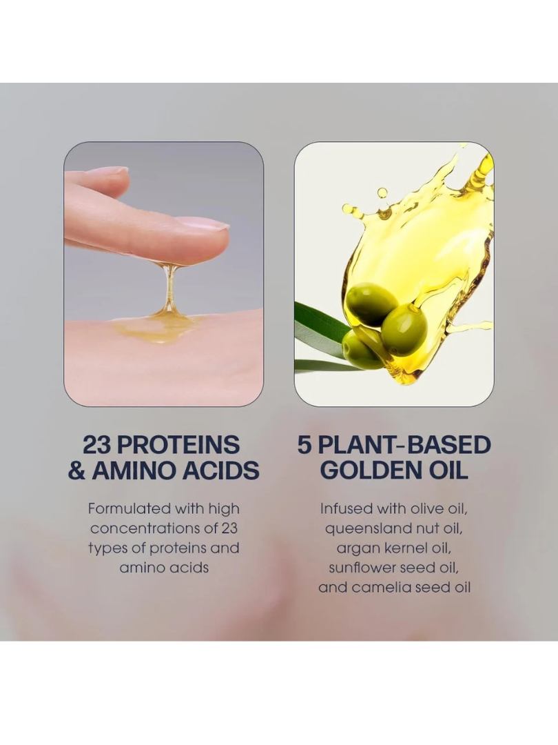 Περιέχει 28 είδη πρωτεϊνών και αμινοξέων όπως υδατοδιαλυτό κολλαγόνο, υδρολυμένο μετάξι, υδρολυμένη κερατίνη , αμινοξέα μεταξιού, 4 είδη υδρολυμένης πρωτεΐνης, 17 είδη αμινοξέων και 5 είδη ελαίων φυτικής προέλευσης – ελαιόλαδο, έλαιο σπόρων μακαντάμια, αργκάν, έλαιο ηλίανθου, έλαιο καμέλιας – συστατικά που παρέχουν πλούσια θρέψη στα μαλλιά, ενώ παράλληλα χαρίζουν λάμψη και απαλότητα.