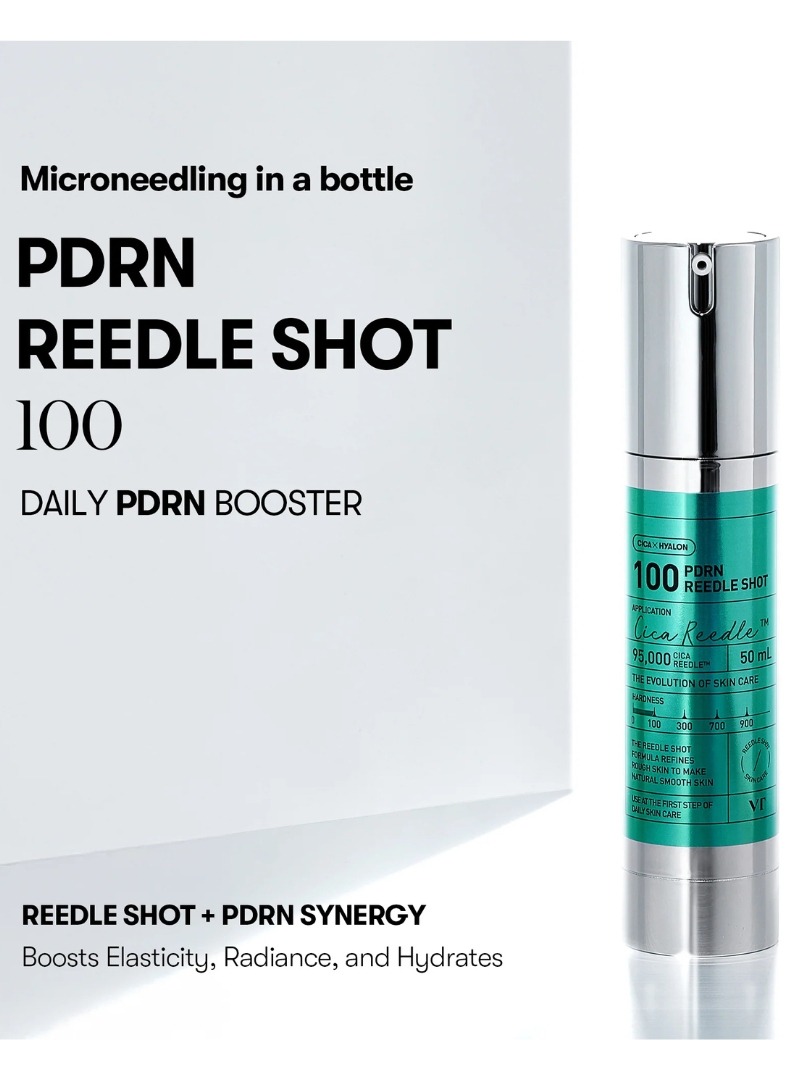 After the cleaning of your face and the use of toner, apply the VT PDRN Reedle Shot 100,