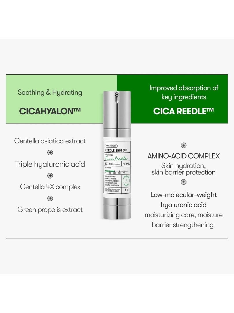 VT Reedle shot 300 which is 3 times more powerful than VT Reedle Shot 100 containing a higher concentration of Cica Reedle™ and delivering active ingredients more intensely.